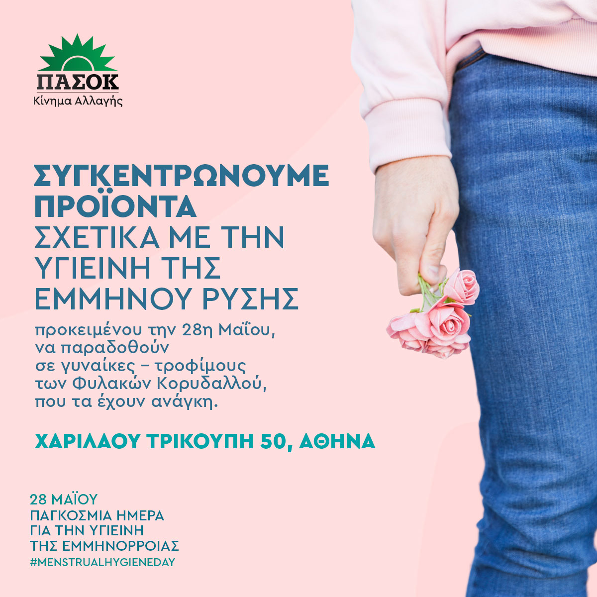 Με αφορμή την 28η Μαΐου, ο Τομέας Ισότητας και ο Τομέας Εθελοντισμού του ΠΑ.ΣΟ.Κ , συγκεντρώνουν  από σήμερα στο ισόγειο των κεντρικών γραφείων του ΠΑ.ΣΟ.Κ (Χαριλάου Τρικούπη 50, Αθήνα) ,  προϊόντα σχετικά με την υγιεινή της Έμμηνου Ρύσης, προκειμένου την 28η Μαΐου , να παραδοθούν σε γυναίκες – τροφίμους των Φυλακών Κορυδαλλού,  που τα έχουν ανάγκη. Κυρίως συγκεντρώνονται τα κάτωθι : Σερβιέτες , ταμπόν, εσώρουχα περιόδου, προϊόντα καθαρισμού για την ευαίσθητη περιοχή.