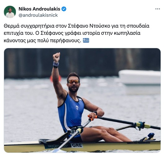 Ανάρτηση Νίκου Ανδρουλάκη, Προέδρου ΠΑΣΟΚ-Κινήματος Αλλαγής, για την κατάκτηση του χρυσού μεταλλίου απο τον Στέφανο Ντούσκο
