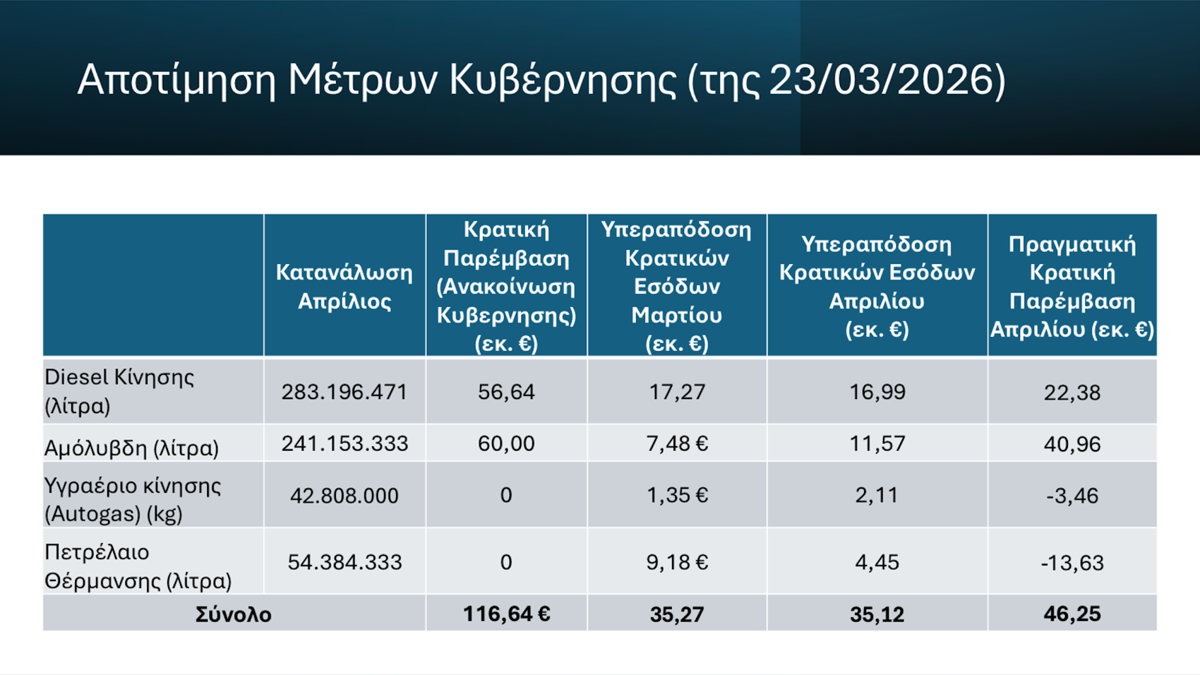 Σε μια συνολική αποτίμηση ο Φραγκίσκος Παρασύρης κατάθεσε και τον παρακάτω πίνακα, τονίζοντας ότι η «ότι η συνολική παρέμβασή της για τον μήνα Απρίλιο ανέρχεται στα 116 εκατομμύρια ευρώ. Ωστόσο, αποσιωπά το γεγονός ότι την ίδια περίοδο καταγράφει αυξημένα έσοδα από τον ΦΠΑ, ως αποτέλεσμα της σημαντικής ανόδου των τιμών λόγω της κρίσης. Με βάση τα έως τώρα διαθέσιμα στοιχεία, τα πρόσθετα αυτά έσοδα ξεπερνούν τα 70 εκατομμύρια ευρώ. Συνεπώς, η καθαρή δημοσιονομική παρέμβαση της κυβέρνησης δεν ανέρχεται στα 116 εκατομμύρια, αλλά περιορίζεται περίπου στα 46 εκατομμύρια ευρώ».