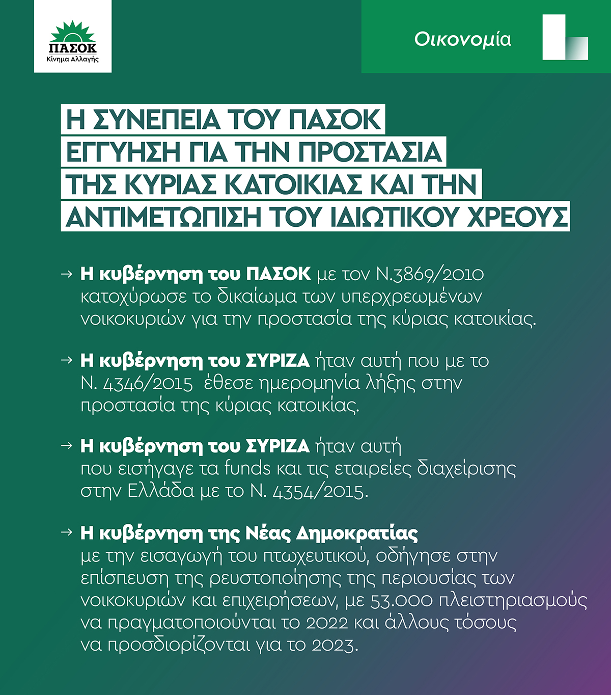 Η Κυβέρνηση του ΠΑΣΟΚ ήταν αυτή που με τον Ν.3869/2010 κατοχύρωσε το δικαίωμα των υπερχρεωμένων νοικοκυριών για την προστασία της κύριας κατοικίας. Εκατοντάδες χιλιάδες νοικοκυριά διέσωσαν τις κατοικίες και πέτυχαν τη ρύθμιση όλων των οφειλών τους με βάση τις πραγματικές τους δυνατότητες. Για τη χώρα μας ο νόμος αυτός ήταν ένα κοινωνικό κεκτημένο. Έναν νόμο που ο ΣΥΡΙΖΑ, ως αντιπολίτευση δεν το ψήφισε, ως κυβέρνηση τον κατήργησε και ουδέποτε, μέχρι και σήμερα, έχει ζητήσει την επαναφορά του.