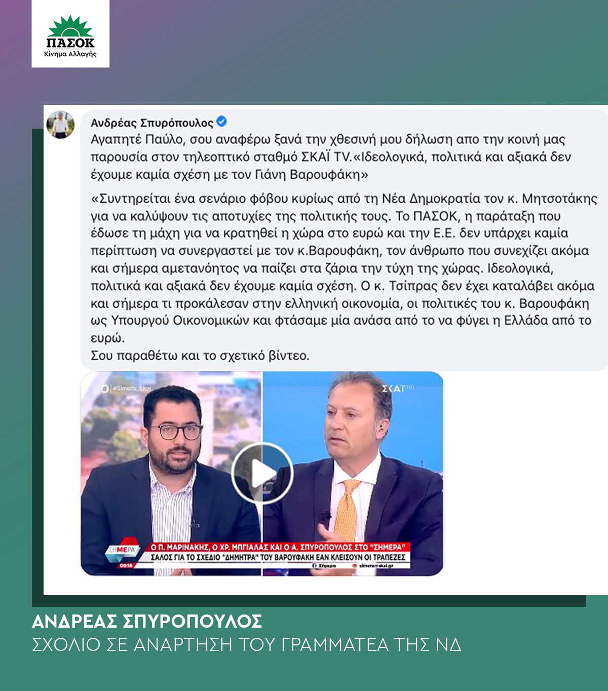 “Συντηρείται ένα σενάριο φόβου κυρίως από τη Νέα Δημοκρατία, τον κ. Μητσοτάκης για να καλύψουν τις αποτυχίες της πολιτικής τους. Το ΠΑΣΟΚ, η παράταξη που έδωσε τη μάχη για να κρατηθεί η χώρα στο ευρώ και την Ε.Ε. δεν υπάρχει καμία περίπτωση να συνεργαστεί με τον κ.Βαρουφάκη, τον άνθρωπο που συνεχίζει ακόμα και σήμερα αμετανόητος να παίζει στα ζάρια την τύχη της χώρας. Ιδεολογικά, πολιτικά και αξιακά δεν έχουμε καμία σχέση. Ο κ. Τσίπρας δεν έχει καταλάβει ακόμα και σήμερα τι προκάλεσαν στην ελληνική οικονομία, οι πολιτικές του κ. Βαρουφάκη ως Υπουργού Οικονομικών και φτάσαμε μία ανάσα από το να φύγει η Ελλάδα από το ευρώ”.