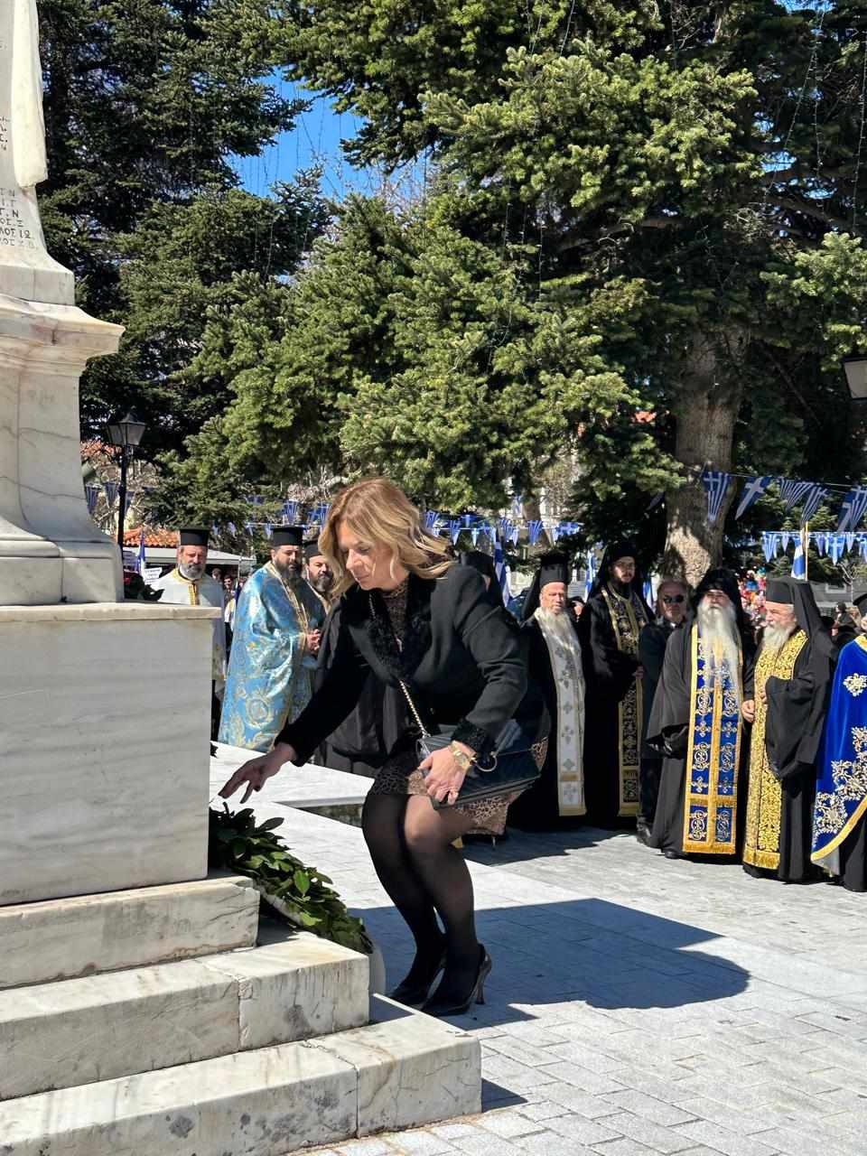 Στη συνέχεια παρακολούθησε μαζί με τους υπόλοιπους πολιτικούς και θεσμικούς φορείς το τρισάγιο στο Μνημείο Πεσόντων Ηρώων και την κατάθεση στεφάνων. Ενώ ακολούθησε η εντυπωσιακή μεγάλη παρέλαση και στη συνέχεια η αναπαράσταση της Ορκωμοσίας των Αγωνιστών και η Έναρξη της Επανάστασης του 1821 από την θεατρική ομάδα “Πάνος Μίχος”. Οι εκδηλώσεις έκλεισαν με χορευτικά από τον Πολιτιστικό Σύλλογο Καλαβρύτων.